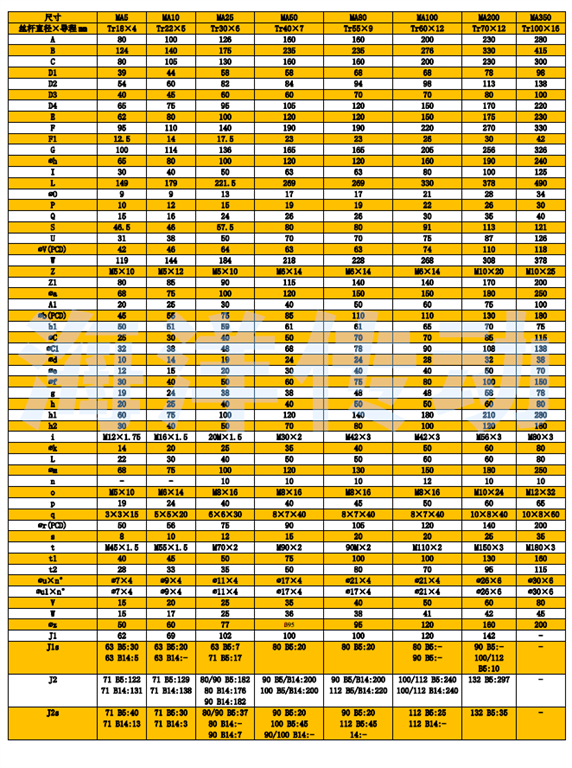 MA系列普通齒螺旋升降機 更適合重載應用:重負荷,高頻繁工作制 額定負載: 0.5噸 -35噸 推桿升降速度可至75mm/s 高輸入轉速: 3000rpm 工作制:30%(10分鐘運行3分鐘) 可選擇雙頭,三頭絲杠配套,參數咨詢我公司 附件:齒隙抵消裝置,防轉轉置,安全螺母,防塵罩,磁感應限位開關