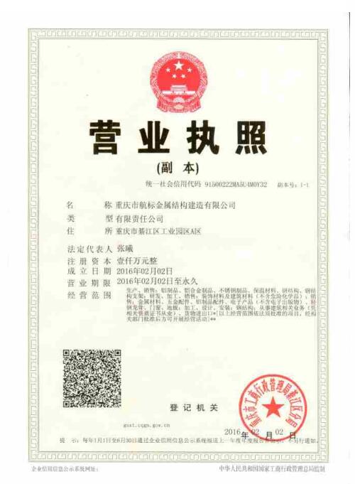 重慶市航標金屬結構建造有限公司主要生產加工三大系列產品:第一是建筑鋁幕墻、建筑新型裝飾材料,如鋁單板、雙曲面鋁單板、鋁質天花板、造型鋁質吊頂板、鋁質蜂窩板、多彩保溫隔熱裝飾一體板的整體制作,以及不銹鋼板、鐵板的成型加工及表面處理;第二是工廠標準化研發制造各種風格的輕鋼建筑和輕重鋼結合建筑,以及其它裝配式建筑,公司引進高智能化輕鋼成型加工生產線和專用軟件,集建筑設計、鋼結構設計、建筑室內外裝飾設計,鋼結構生產加工、鋼結構裝配安裝、建筑物室內外裝飾裝修全套服務于一體。客戶只需表達所需建筑物使用功能意愿,我司即可給出多套設計方案供客戶選擇,按照客戶選定的方案進行快速、高效、節能、安全環保的加工建造。我司推出世界各國不同風格、造型各異、全精裝二到三層80——600㎡的輕鋼別墅,從設計到交付使用只需要兩個月左右即可完工;第三是公司配置了目前國內先進的開平生產線,專業致力于厚度1.0——6mm,寬度600——2000mm的鋁卷加工、銷售。
