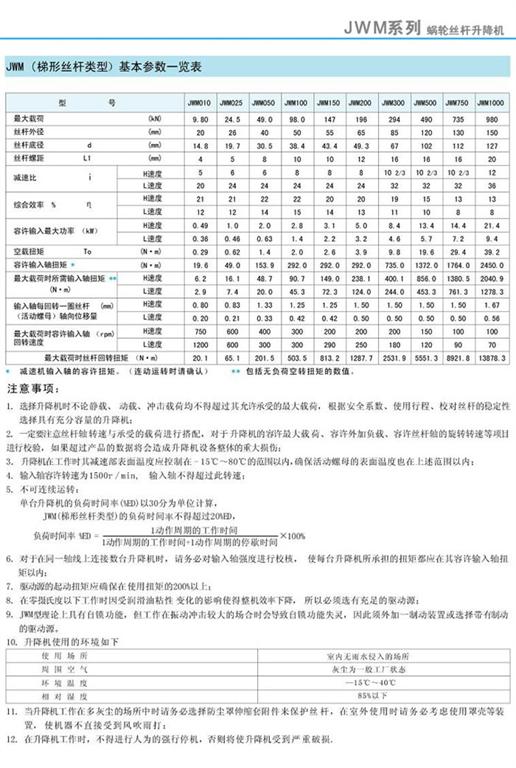 JWM升降機(梯形絲桿類型)基本參數一覽表