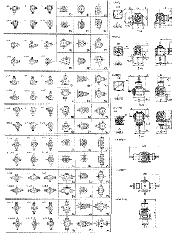 T系列螺旋錐齒輪傳動箱軸配置及軸旋轉(zhuǎn)方向的關系、安裝方位及尺寸表