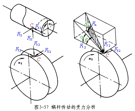 圖3-57所示的蝸桿傳動中,在蝸桿與蝸輪的嚙合點C上,作用著大小相等、方向相反的法向力Fn。這法向力Fn可以分解成三個互相垂直的分力:切向力Ft、軸向力Fx及徑向力Fr。由于蝸桿軸與蝸輪軸交錯成90°,故蝸桿切向力Ft1等于蝸輪軸向力Fx2,蝸桿軸向力Fx1等于蝸輪切向力Ft2,蝸桿徑向力Fr1等于蝸輪徑向力Fr2。它們分別是一對作用力與反作用力。即: