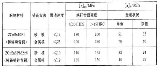 2、蝸輪材料及許用應力 錫青銅:減摩性、耐磨性好,抗膠合能力強,但價格高,用于相對滑動速度vs≤25m/s的高速重要蝸桿傳動中; 鑄鋁青銅:強度好、耐沖擊而且價格便宜,但抗膠合能力和耐磨性不如錫青銅,一般用于vs ≤10m/s的蝸桿傳動中; 灰鑄鐵:用于vs ≤2m/s的低速、輕載、不重要的蝸桿傳動中。